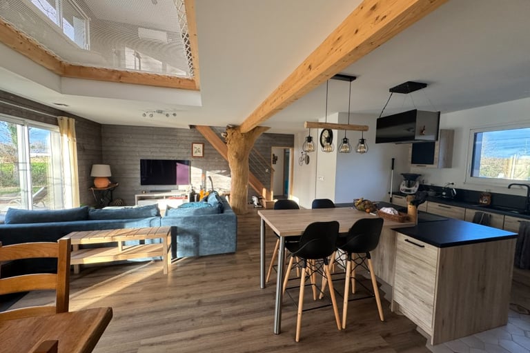 Création d'un salon d'une salle a manger d'une cuisine avec un arbre comme poteau principal et un filet de catamaran pour le plaisir des enfants. Sol souple, lambris bois couleur taupe
